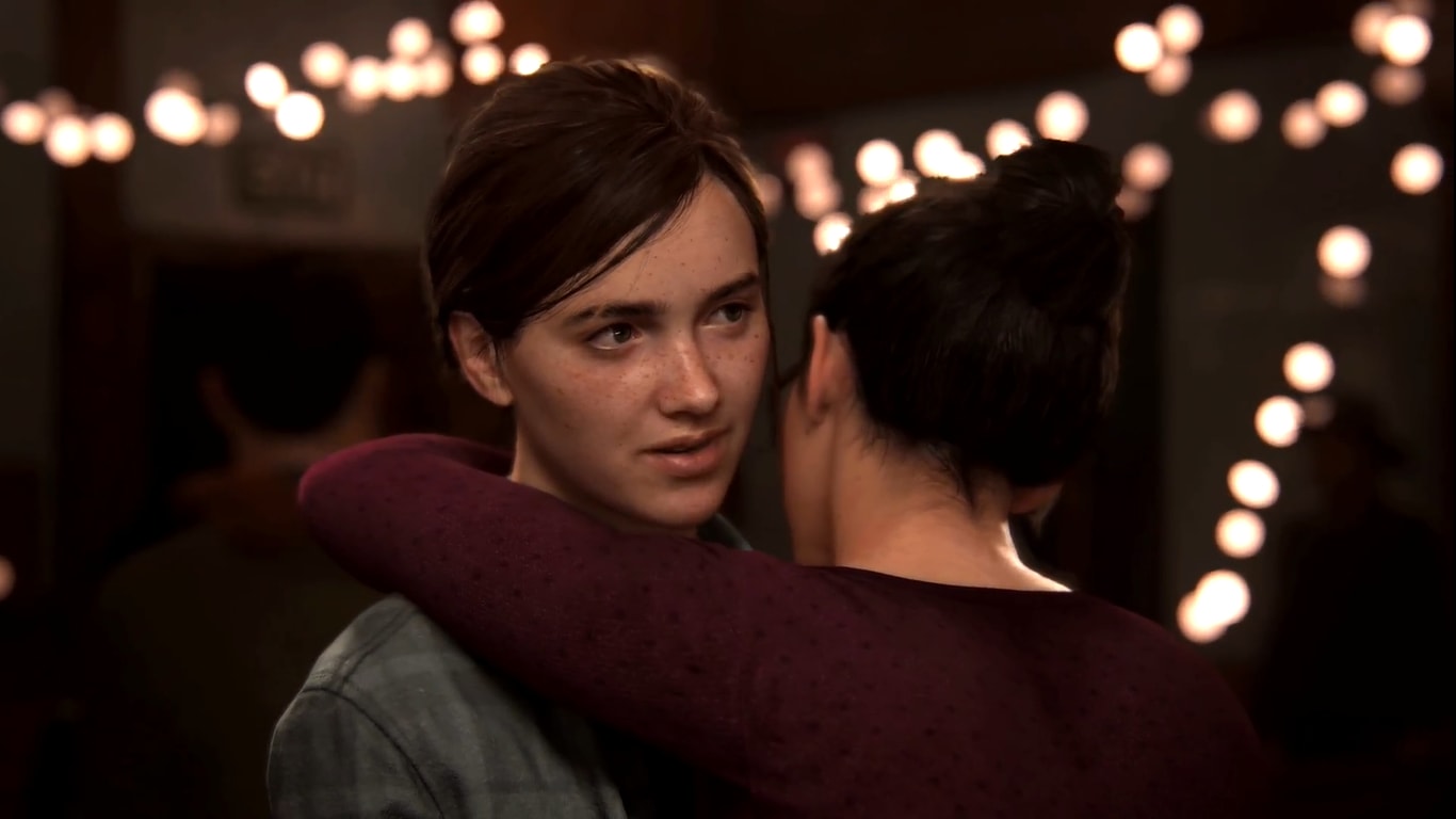 In the newest gameplay trailer, we watch a cutscene of Ellie at a party with what we can assume is the refuge of survivors that Joel and Ellie choose to stay with at the end of the first game. During this party, Ellie is invited onto the dance floor with a woman named Dina. They sway back and forth to a slower ballad, shedding some light on who Ellie has become and who she is to Dina. At the end of this cutscene, Dina and Ellie kiss. This immediately smashes from cutscene into gameplay, taking place at a supposed later time as Ellie hunts down a band of baddies in a forest and a rundown city street.