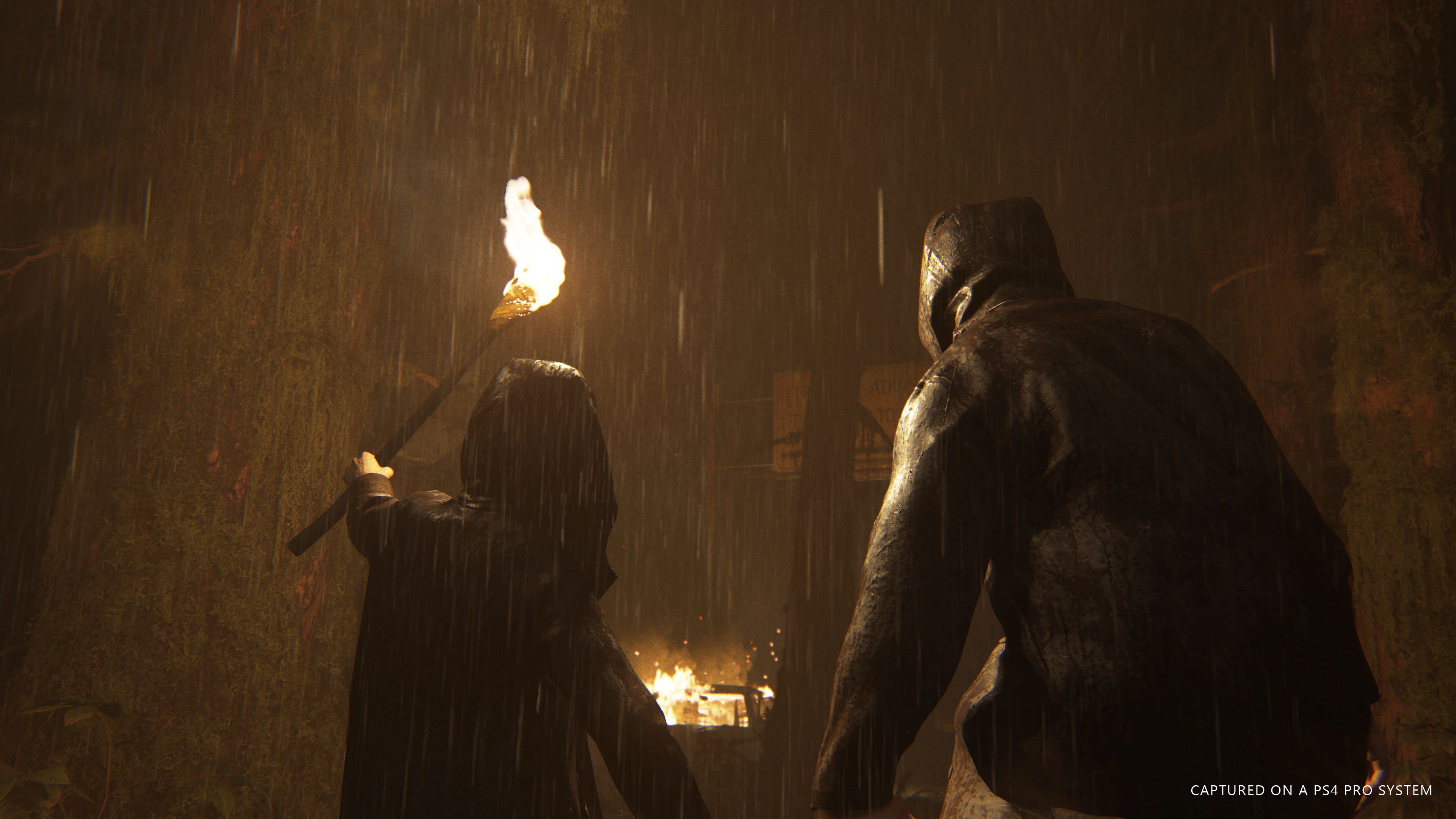 Before she can plunge the knife into the woman’s stomach, a whistle sounds out, much like the one we’ve hear later in the gameplay trailer. The zealot stops, but before the whistle can be investigated, the two hooded figures drag another woman before the zealot, who asks the woman, “where is the other apostate?” The woman spits in the face of the zealot, leading to a brutal and gory punishment. The goons hold the woman down and beat at her arms with a hammer. The scene is harsh and graphic and proves that the sequel will heighten the gore from the first game.