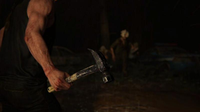 As the enemies face the other direction, Ellie uses this opportunity to draw her bow. The reticle lands atop one of the enemies and Ellie fires a shot, killing the baddie instantly. Here, the combat is much akin to the original’s, but with a brand new reticle for those distant stealth kills. Ellie continues to sneak through the garage, avoiding detection, but before long she’s noticed and has to go into full on close quarters combat. In this moment we see that the gameplay has evolved to more of a dynamic experience from the first game. As Ellie is spotted, quickly draws her knife and kills one enemy, but then has to avoid the violent swings of an axe-wielding enemy. It seems that while in combat, the player is able to quickly avoid the swings of the axe. The fight continues, leading Ellie to the outside where she’s shot at by multiple bad guys. Ellie draws her pistol and fights back, giving us a look at the gun combat as well.